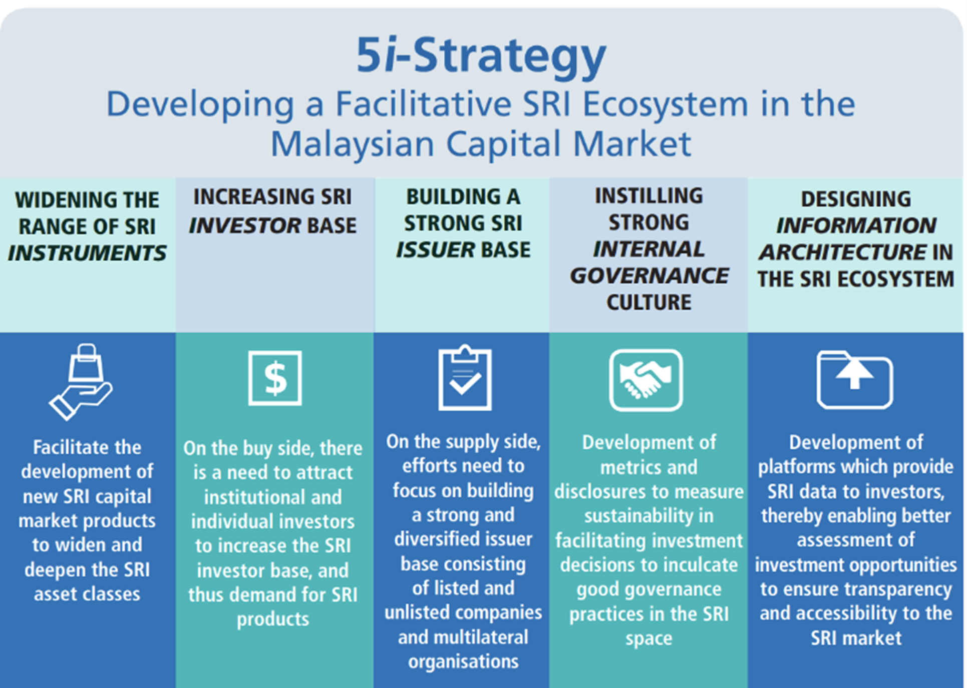 マレーシア証券委員会(SC)は、資本市場におけるESGの導入を促進するため、「持続可能かつ責任ある投資(Sustainable and Responsible Investment =SRI)ロードマップ2019-2025」を策定している。SCは、マレーシアの資本市場においてSRIを推進するため、5つのSRI戦略を導入しており、以下の図にその概要が示されている[1]。これらの戦略は、SRIの金融商品、発行体、投資家及び補完的サービスの範囲を拡大するとともに、イスラム金融という既存のグローバルなリーダーシップ分野との相乗効果を活用しつつ、情報開示及びガバナンスの強化を図ることを目的としている。