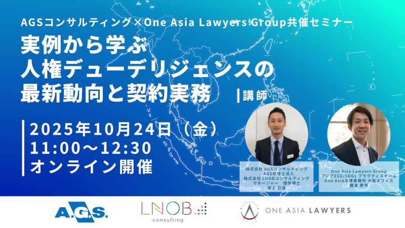 【ウェビナー】2025年10月24日:「実例から学ぶ人権デューデリジェンスの最新動向と契約実務」(One Asia Lawyers Group×AGSコンサルティング 共催)に難波 泰明弁護士が登壇いたします。