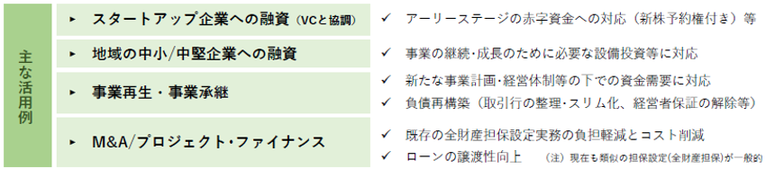この企業価値担保権の活用例として、以下のシーンが想定されています。[1]