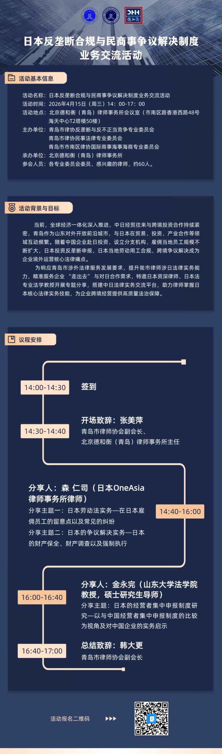 2026年4月15日に開催される中国・青島市律師協会主催「日本の独占禁止法遵守および民事・商事紛争解決制度に関するビジネス交流イベント」内のセミナーに森 仁司弁護士が登壇します。