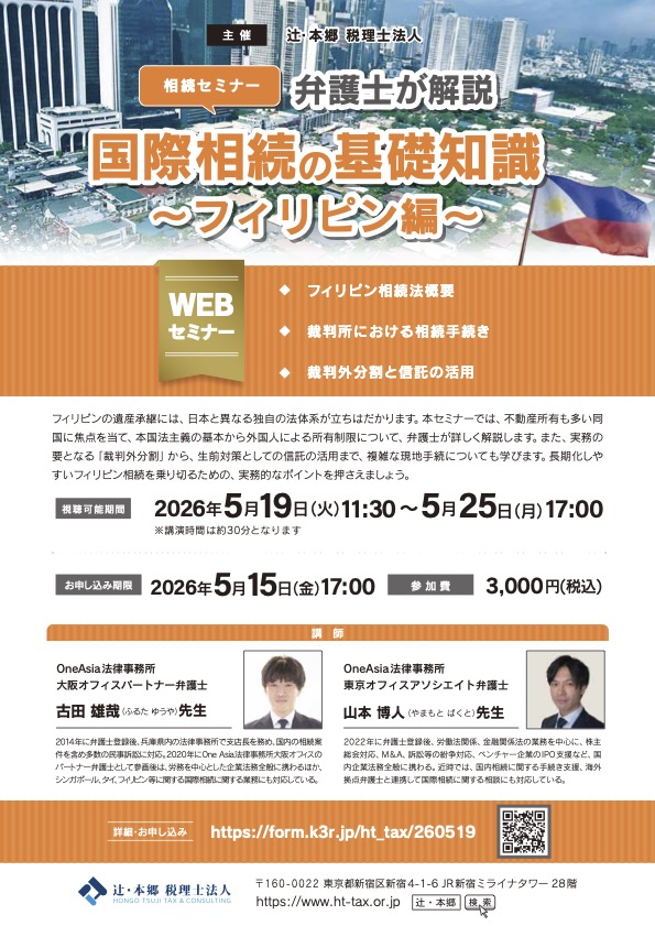 辻・本郷税理士法人主催「弁護士が解説 国際相続の基礎知識〜フィリピン編〜」セミナーに弊所の古田雄哉弁護士および山本博人弁護士が登壇いたします。